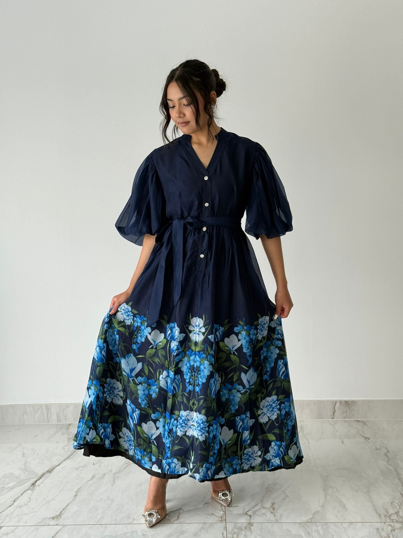 A graceful, flowing maxi dress in a deep navy shade, adorned with a delicate blue floral print cascading along the lower half. Featuring a flattering V neckline and detailed with elegant buttons, this dress is completed with soft balloon sleeves that create a romantic and feminine silhouette. The detachable belt lets you define your waist for a polished finish. Ideal for everything from garden parties to evening soirees.