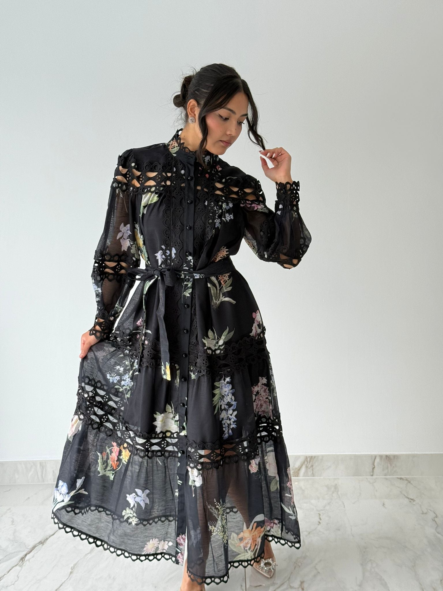An elegant black maxi dress featuring soft, delicate floral patterns that add a timeless charm. Crafted from breathable cotton for an airy, comfortable feel, this dress is detailed with a row of buttons down the front and finished with intricate lace accents that enhance its sophisticated appeal. Long sleeves and an included belt allow for a flattering, tailored fit. Perfect for classy daytime events or evening gatherings.