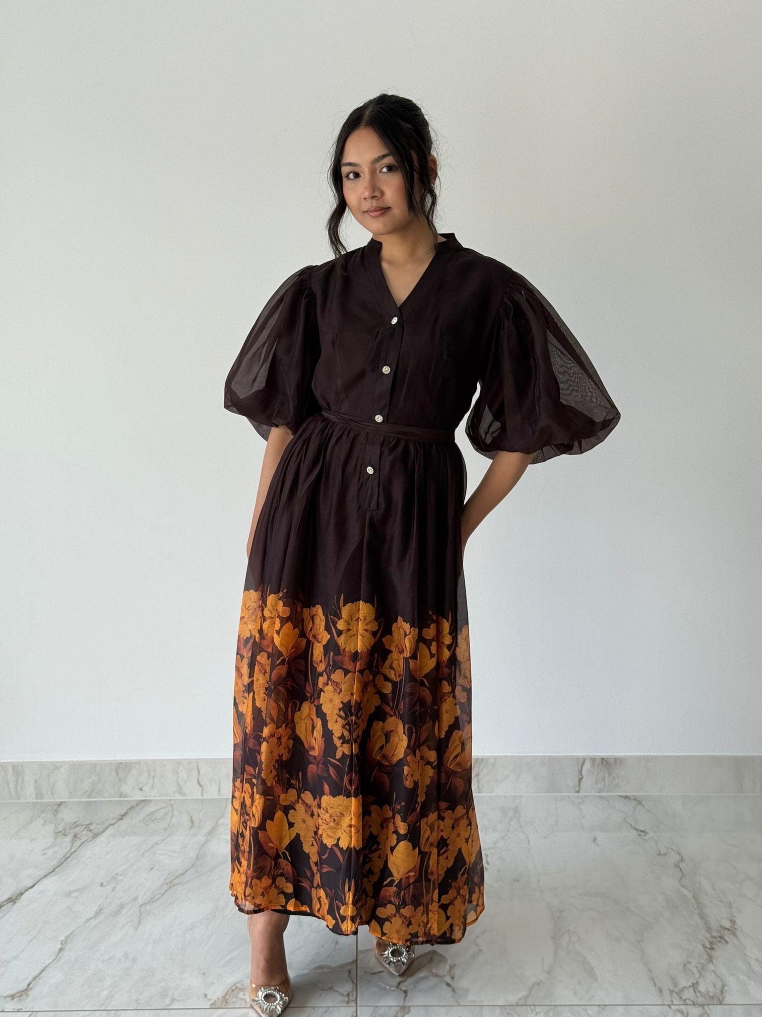 A rich, flowing maxi dress in a deep chocolate tone, featuring a soft floral print in warm burnt orange hues along the lower half. Designed with a flattering V neckline and embellished button detailing that adds a subtle touch of glamour. The silhouette is floaty and elegant, finished with a detachable belt for versatile styling. Perfect for all occasions, from garden gatherings to evening events.