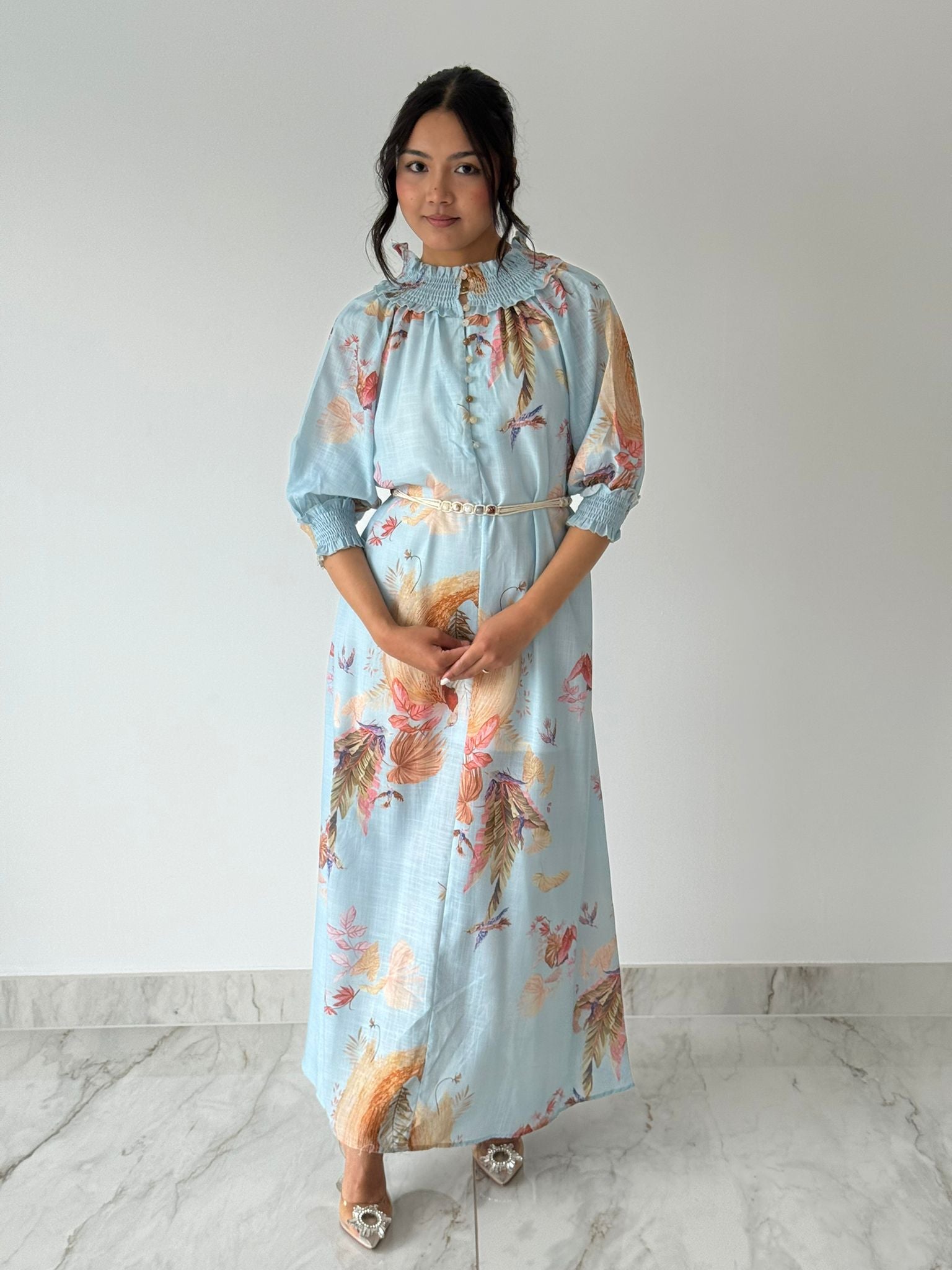 A breezy, cotton-feel maxi dress inspired by timeless Zimmerman elegance, featuring a soft light blue hue perfect for sunny days and seaside strolls. Designed with a flattering half-button front and a delicate string belt to cinch the waist, this dress offers effortless style and comfort. Its flowy silhouette and breathable fabric make it ideal for beach outings, casual gatherings, or relaxed summer events.