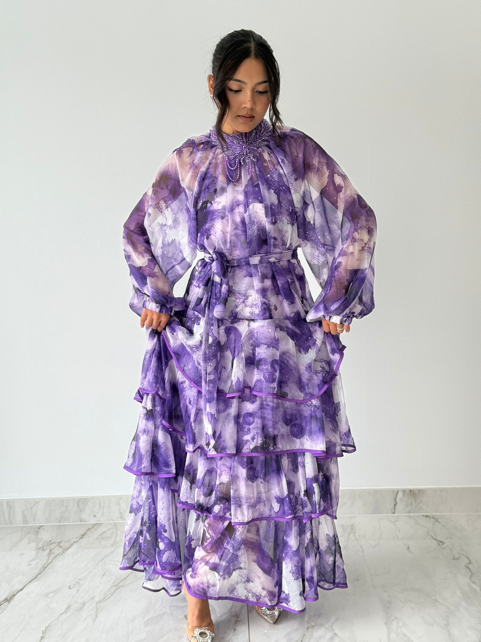 A dreamy full-length dress in a soft watercolour purple print, complete with layered ruffle tiers for elegant movement and flow. The high neckline features delicate beaded embellishment, adding a touch of glamour and refinement. Made from lightweight sheer fabric and paired with a full-length inner slip for modest wear. A beautiful choice for weddings, special events, or Eid celebrations.
